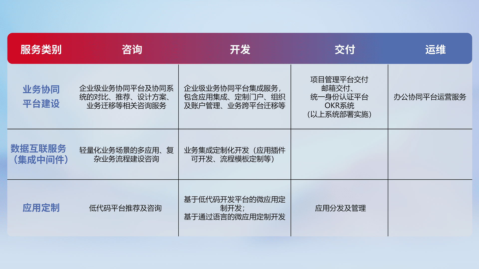 针对钉钉、、企微、、IDaas等平台级产品提供产品的规划、、、方案、、、、交付、、、、定制化开发等服务,,实现如统一协同办公、、智能客户服务、、、、混合会议管理、、、、智能数据查询、、、等业务场景,,实现数字化转型。。。